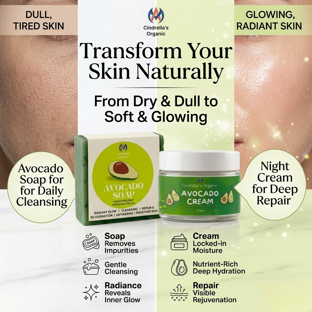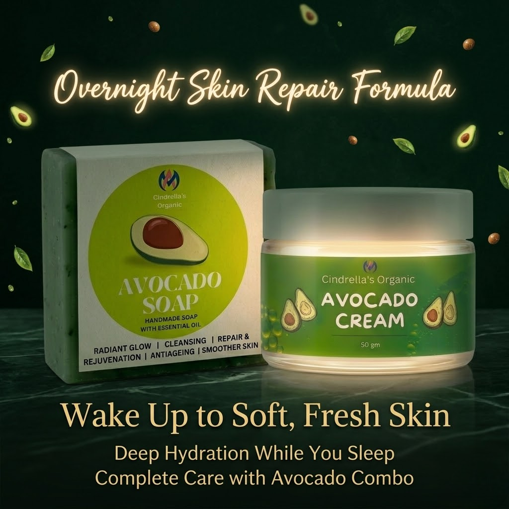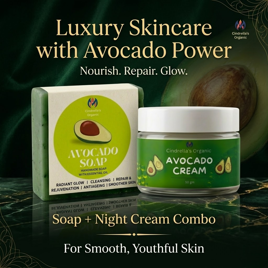 CINDRELLAS ORGANIC Avocado Combo is specially crafted to deeply moisturize, repair, and rejuvenate your skin naturally. This combo includes a gentle Avocado Soap for daily cleansing and a rich Avocado Night Cream that works overnight to restore your skin’s glow 🌙✨