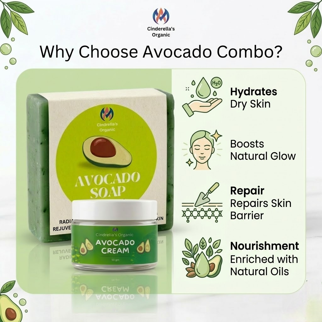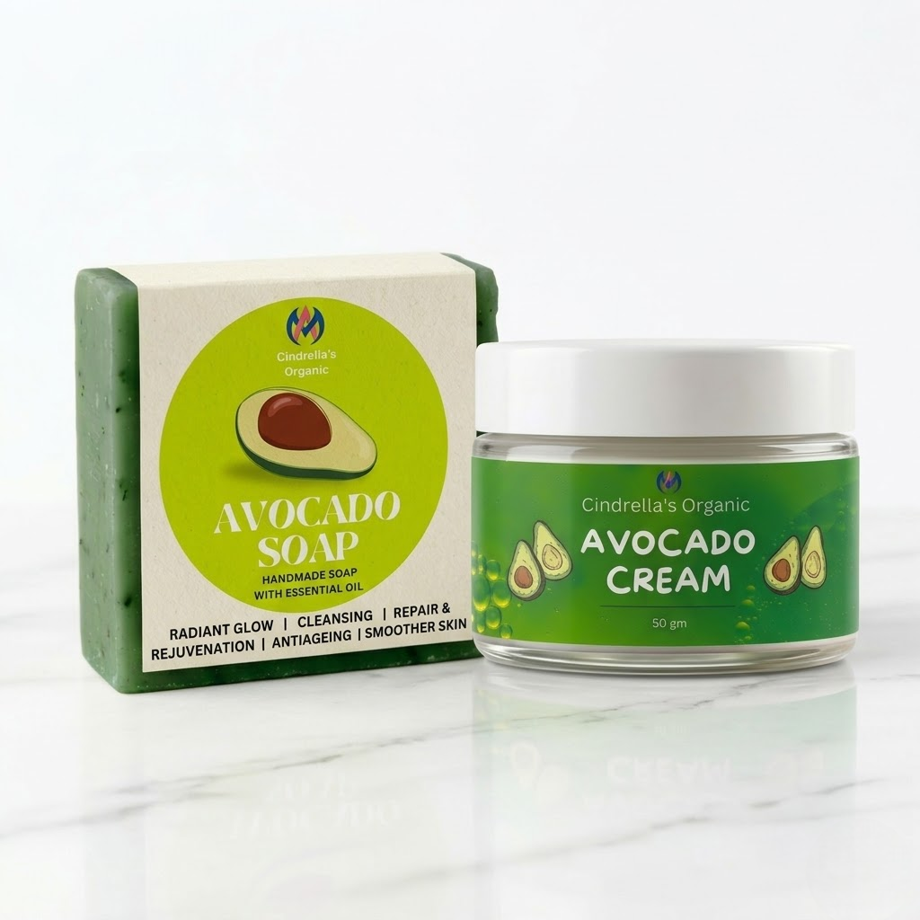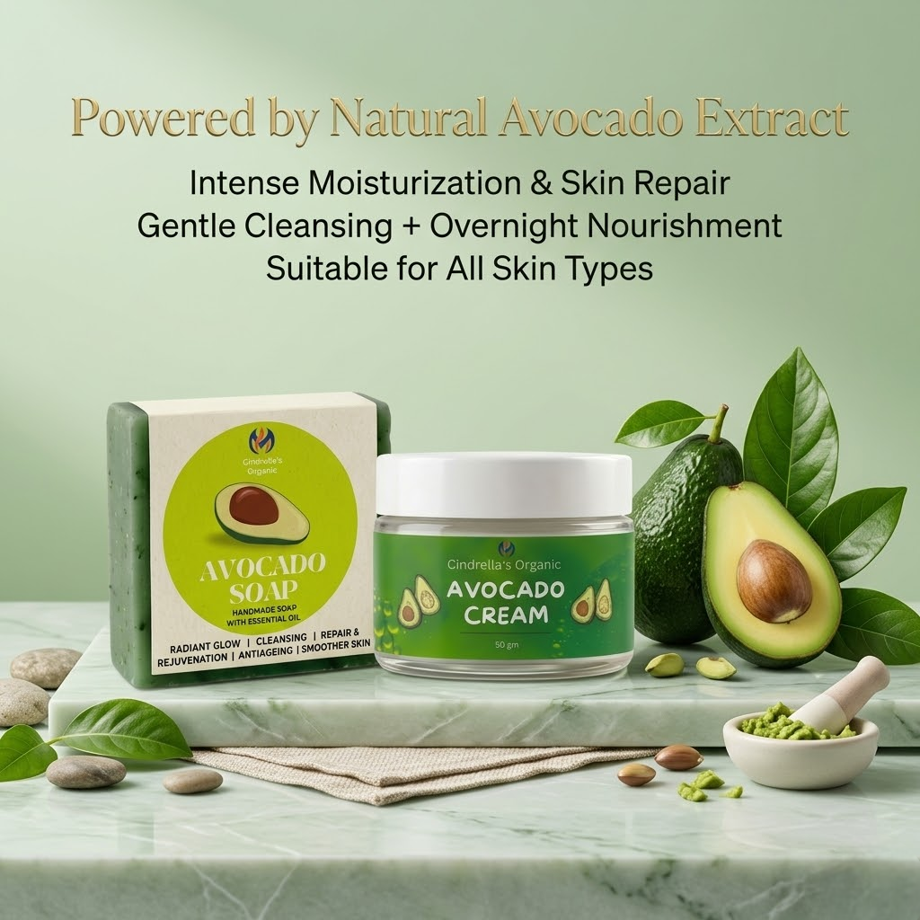 CINDRELLAS ORGANIC Avocado Combo is specially crafted to deeply moisturize, repair, and rejuvenate your skin naturally. This combo includes a gentle Avocado Soap for daily cleansing and a rich Avocado Night Cream that works overnight to restore your skin’s glow 🌙✨