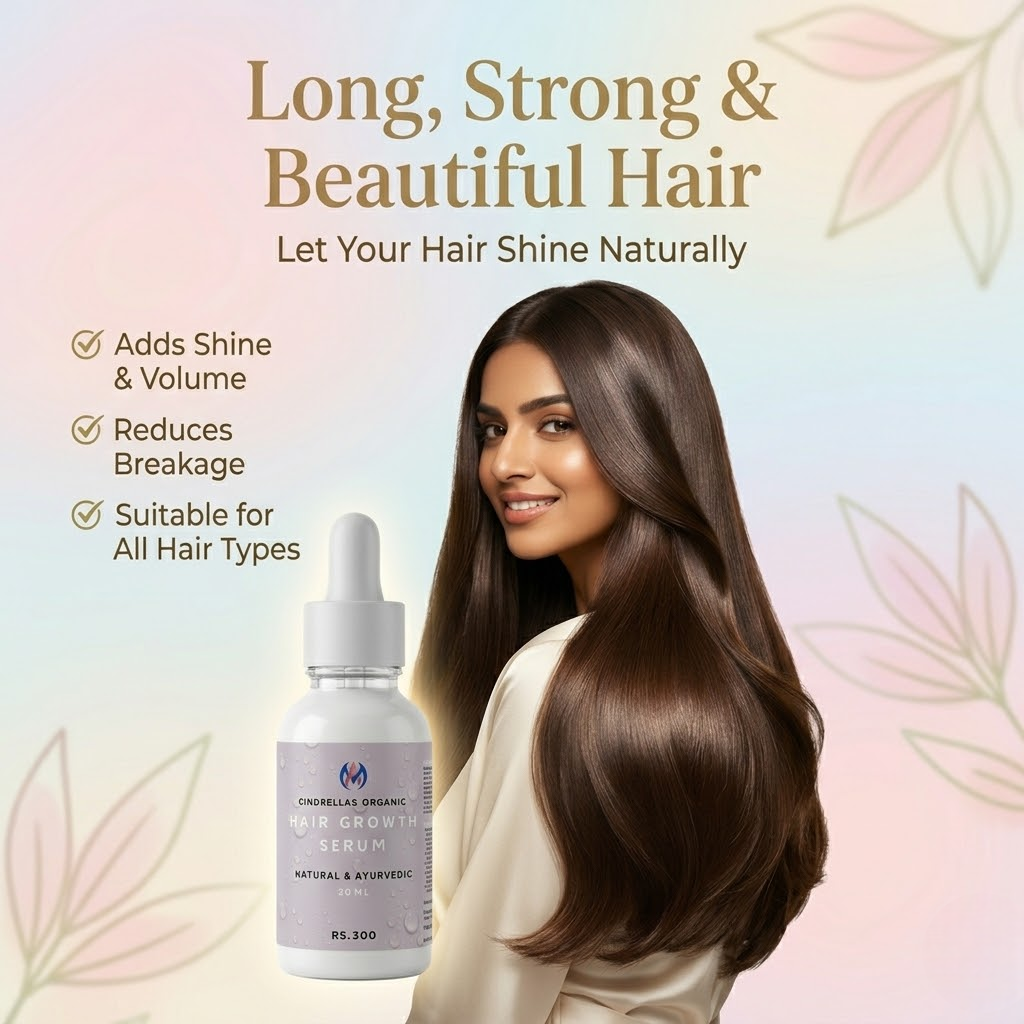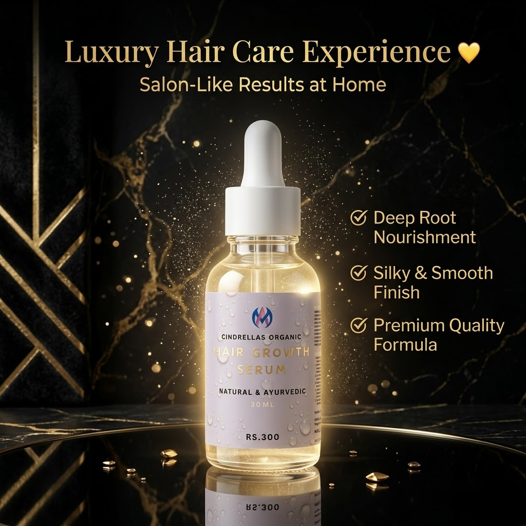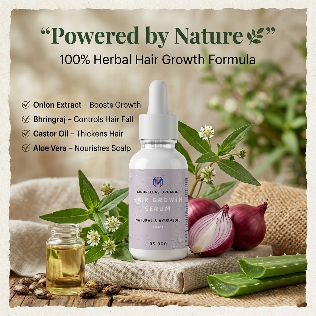 CINDRELLAS ORGANIC Hair Growth Serum is a powerful blend of natural herbs and nourishing oils designed to promote healthy hair growth, reduce hair fall, and strengthen hair from root to tip. This lightweight, non-sticky formula penetrates deep into the scalp, revitalizing hair follicles and improving overall scalp health.