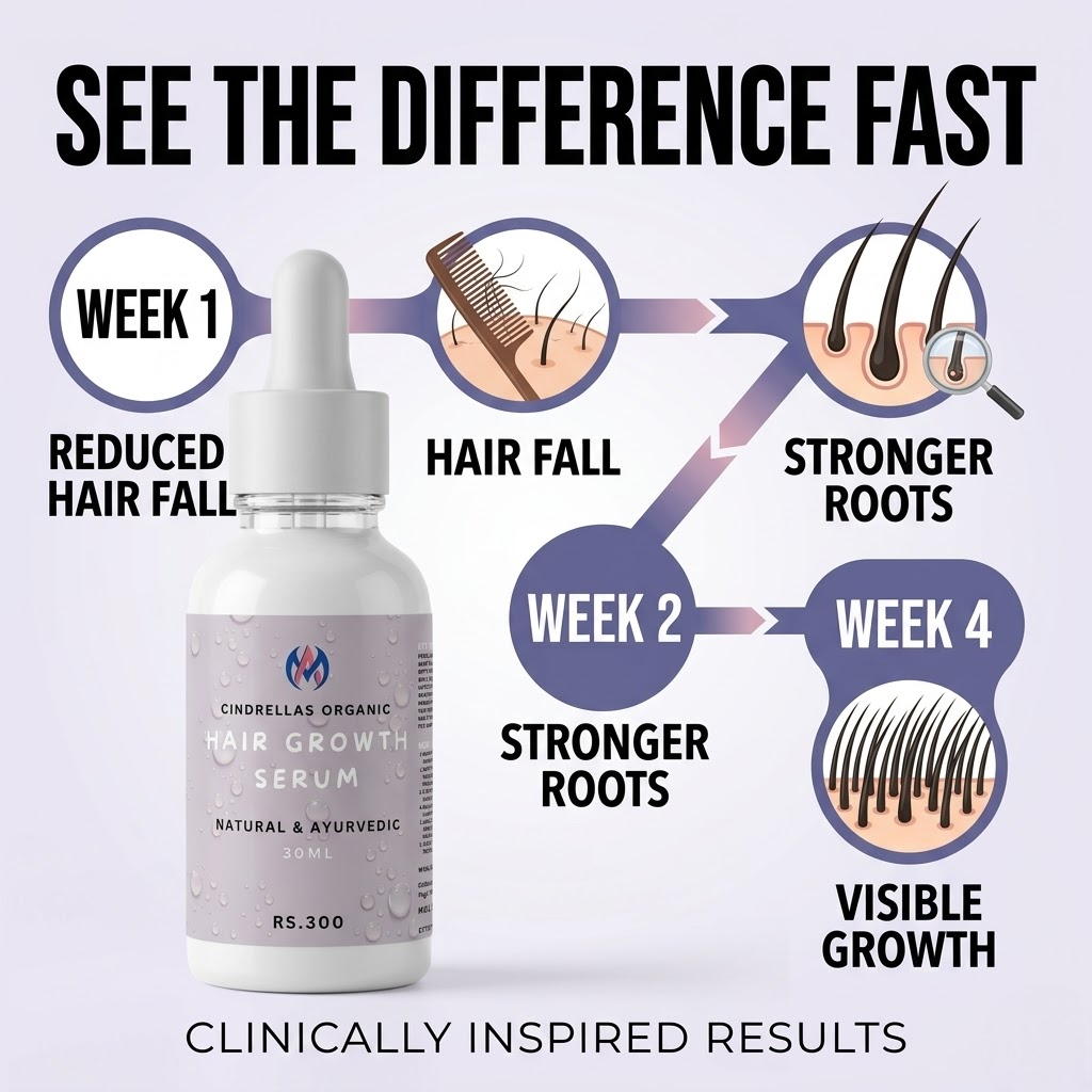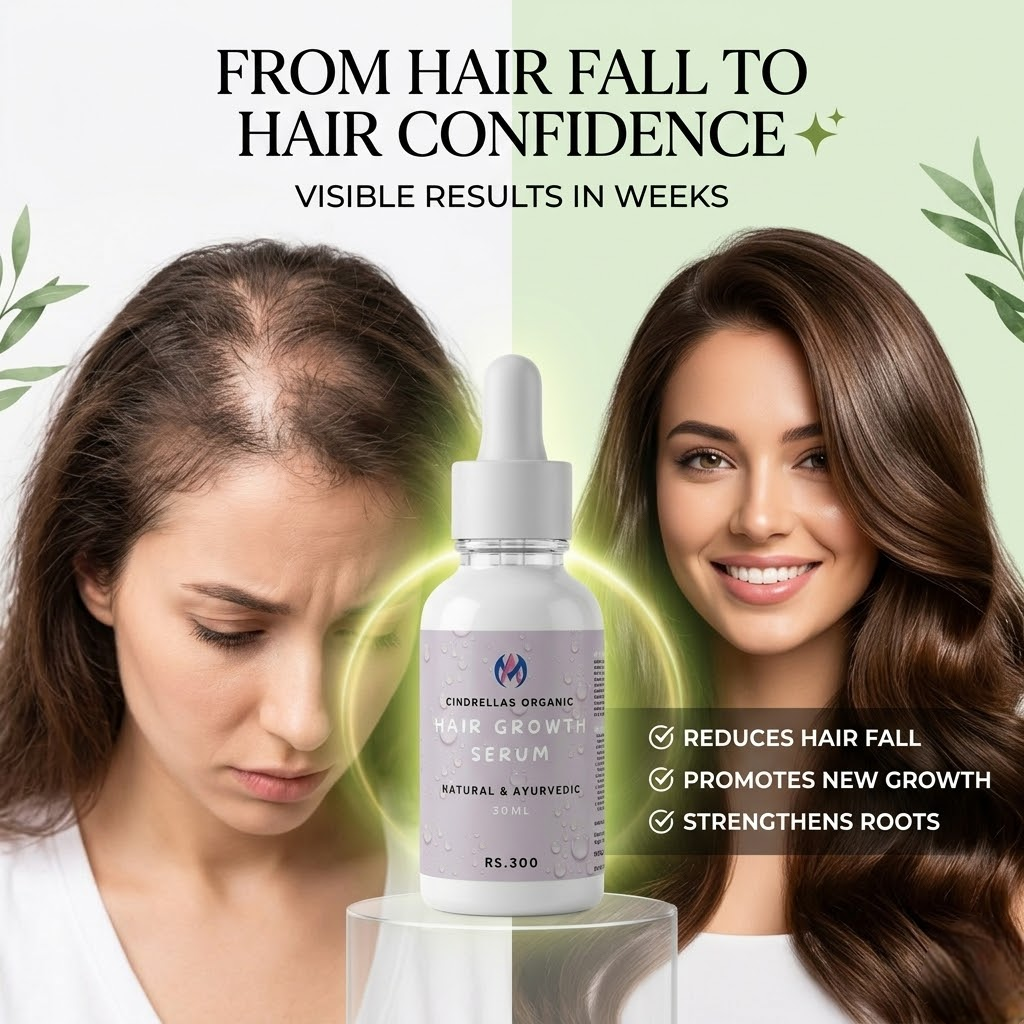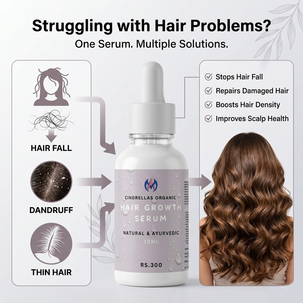CINDRELLAS ORGANIC Hair Growth Serum is a powerful blend of natural herbs and nourishing oils designed to promote healthy hair growth, reduce hair fall, and strengthen hair from root to tip. This lightweight, non-sticky formula penetrates deep into the scalp, revitalizing hair follicles and improving overall scalp health.