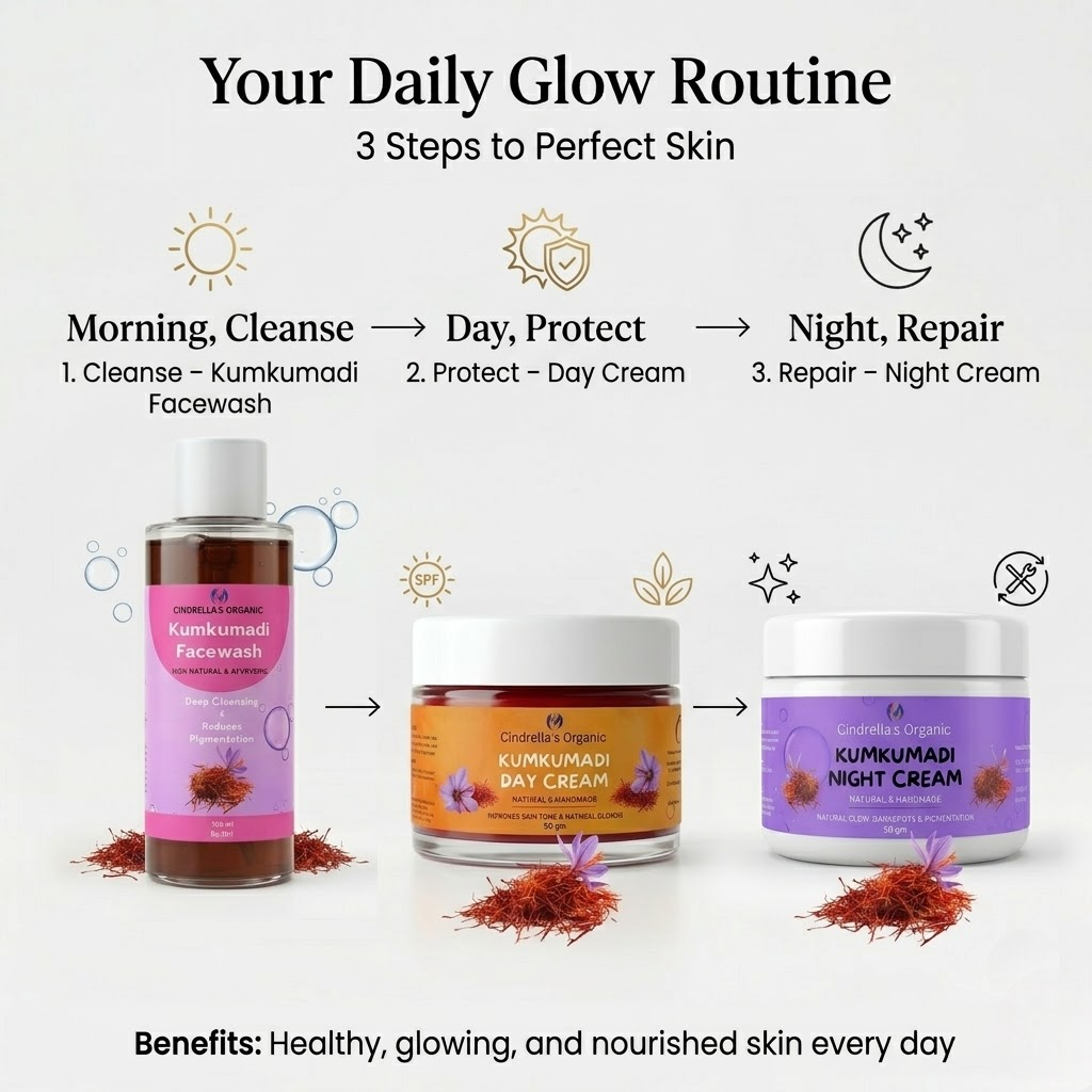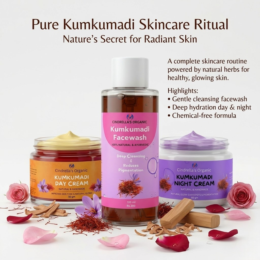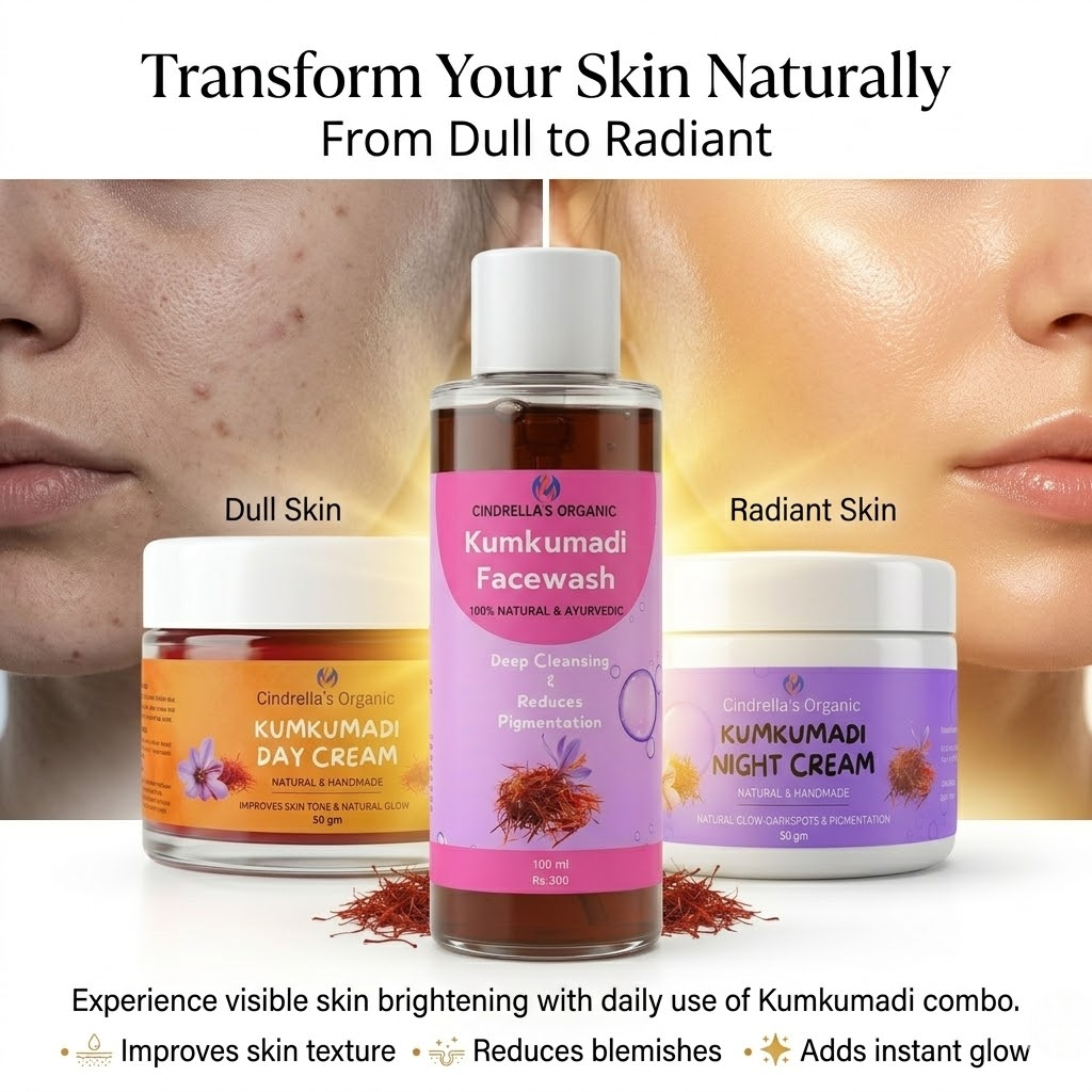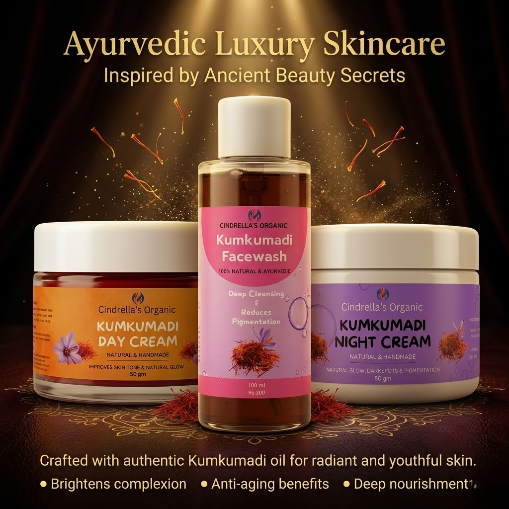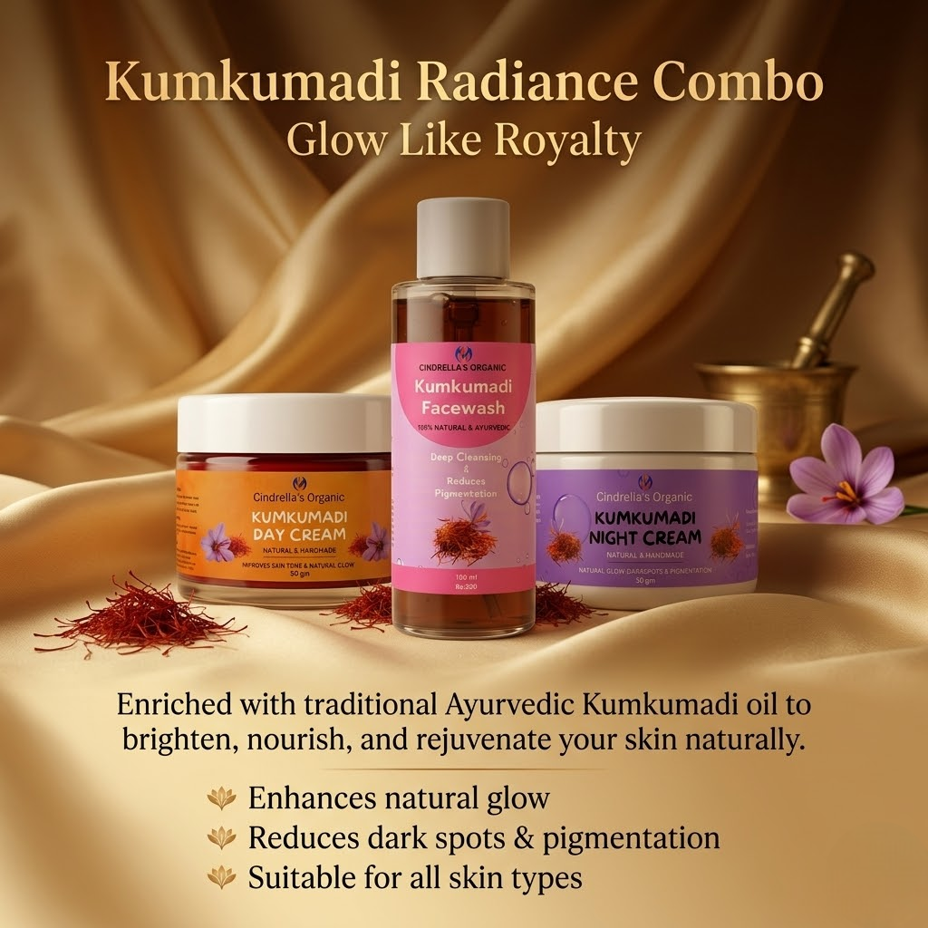 Unlock radiant, glowing skin with the luxurious Kumkumadi Combo by Cindrellas Organic 💛 This Ayurvedic skincare trio is enriched with the goodness of Kumkumadi (saffron-based herbal blend), known for enhancing skin brightness, reducing pigmentation, and improving overall skin texture.