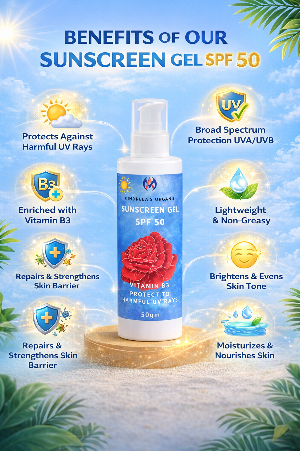 Protect your skin the natural way with Cindrellas Organic Sunscreen Gel 🌞✨. This lightweight, non-greasy gel helps shield your skin from harmful UV rays while keeping it hydrated, fresh, and comfortable all day 💧🌸